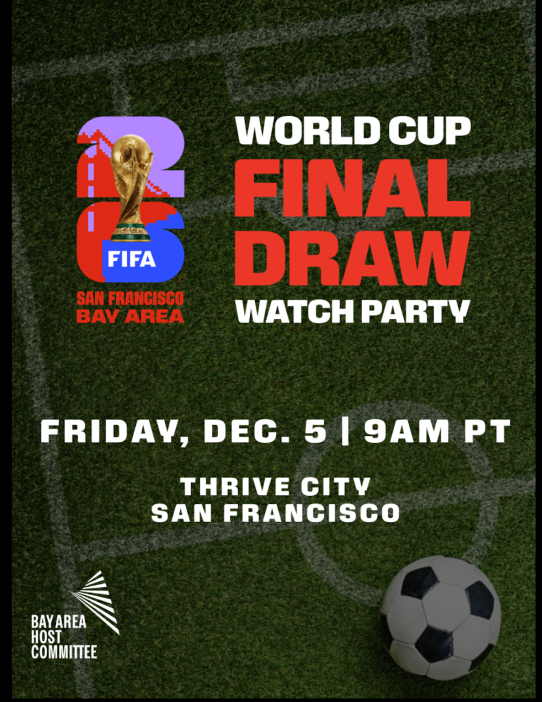 Join the Bay Area Host Committee this Friday, Dec. 5 at 9 a.m. at Thrive City as we celebrate the World Cup Final Draw — Come kick off this global moment with our hometown community! Free and open to all fans. Reserve your spot now.